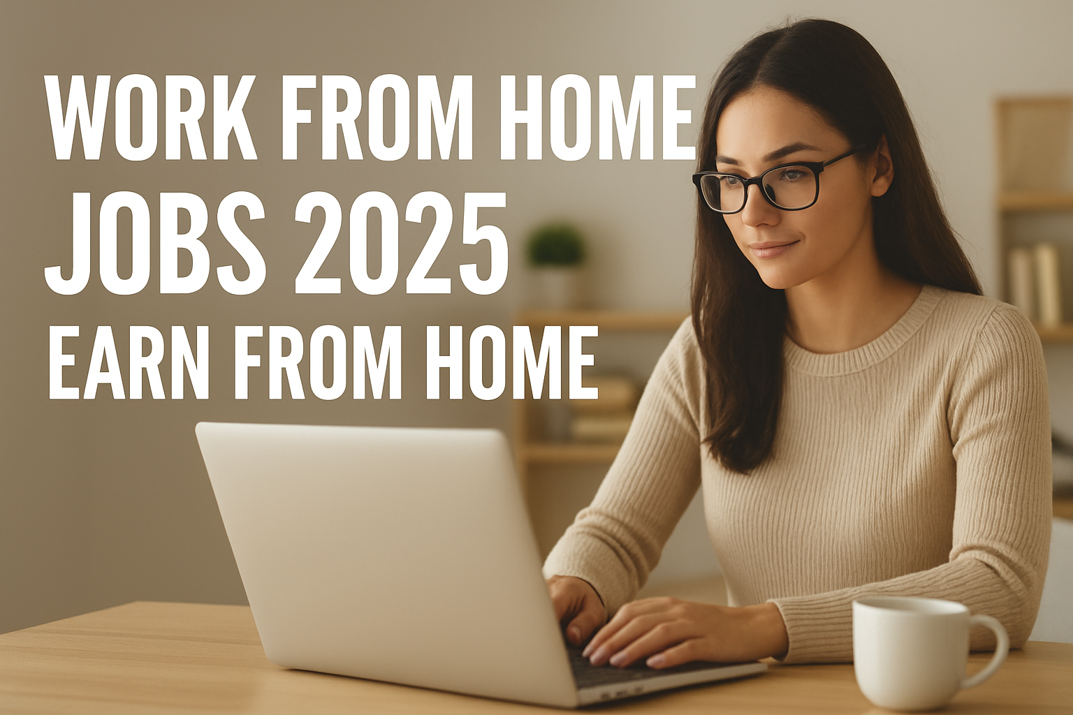 Featured Image Suggestion: A modern home office setup showing a person working on a laptop with coffee beside them, symbolizing flexibility and productivity — captioned “Work From Home Jobs 2025 – Earn from Home.”